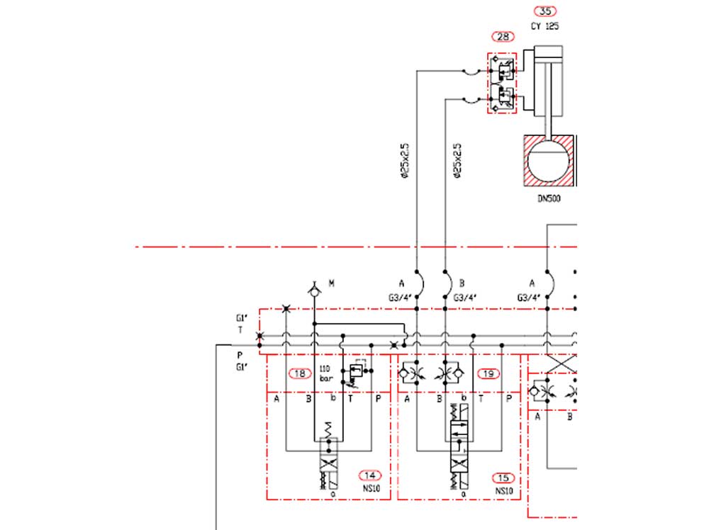 Desenhos e esquemas hidráulicosEsclarecimentos sobre o funcionamento de componentes e interpretação simbólica presente nos esquemas de acionamento da máquina