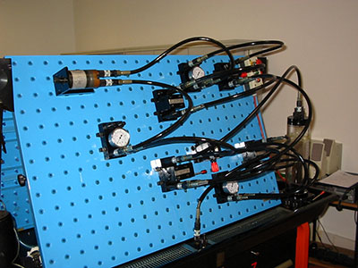 Ambiente em sala do ClienteSão fornecidos esquemas simples ao grupo e pedida a instalação correta de circuitos hidráulicos em banca didática